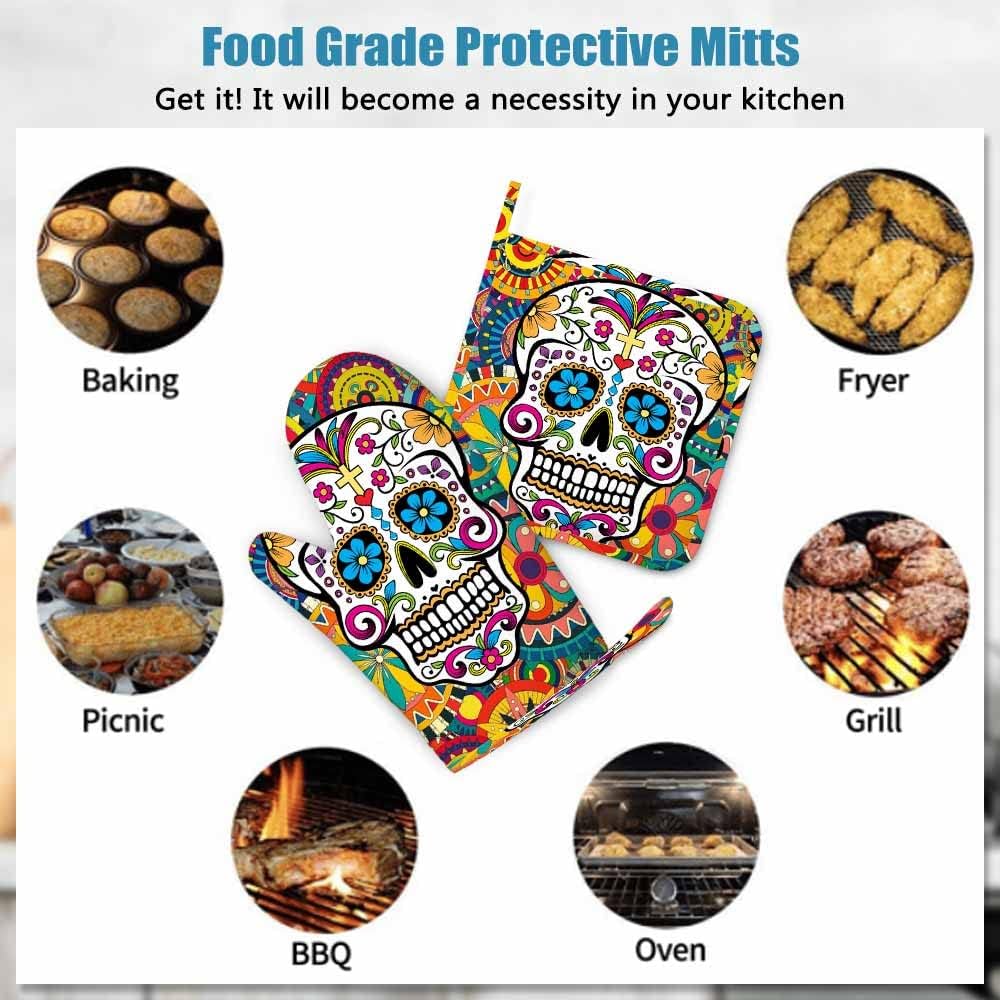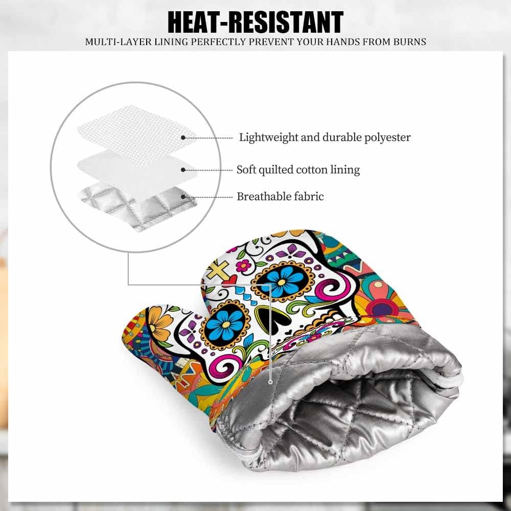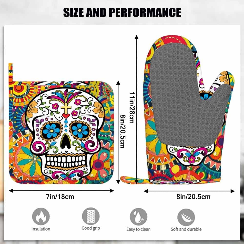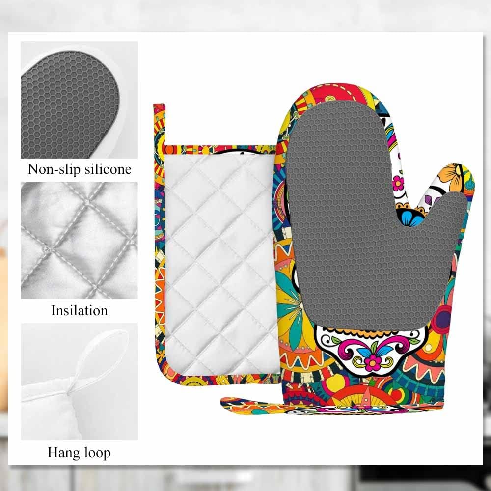 Art Floral Sugar Skull Silicone Oven Mitts and Pot Holders Sets BBQ Gloves for Kitchen,Cooking,Baking,Grilling