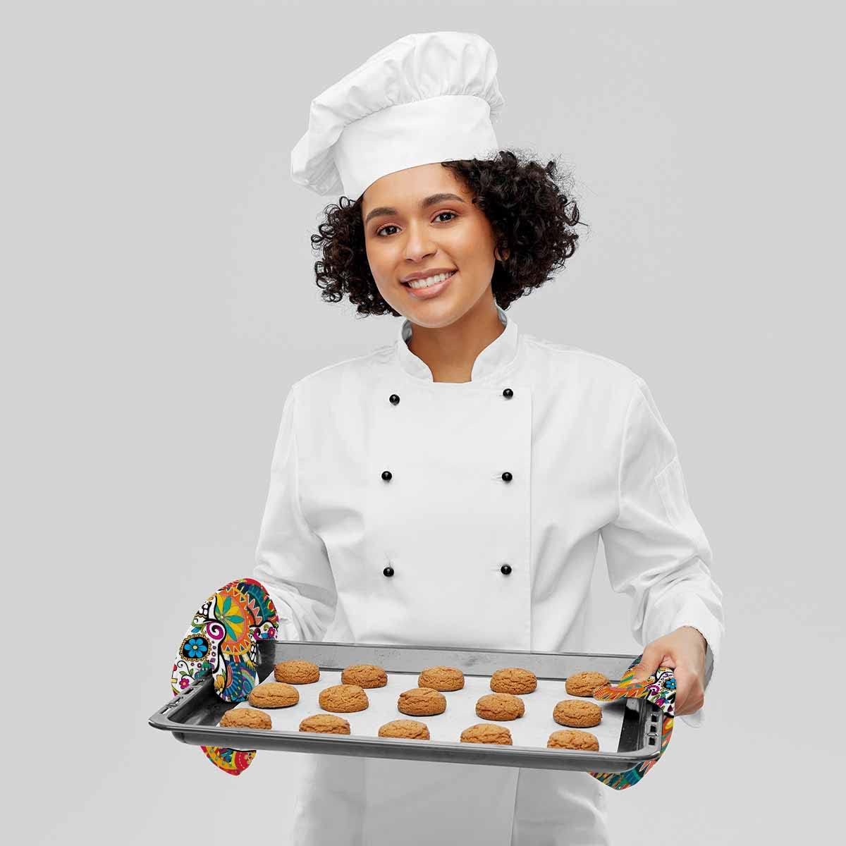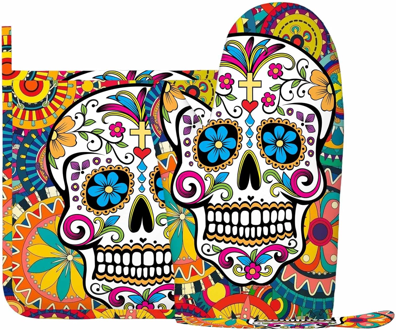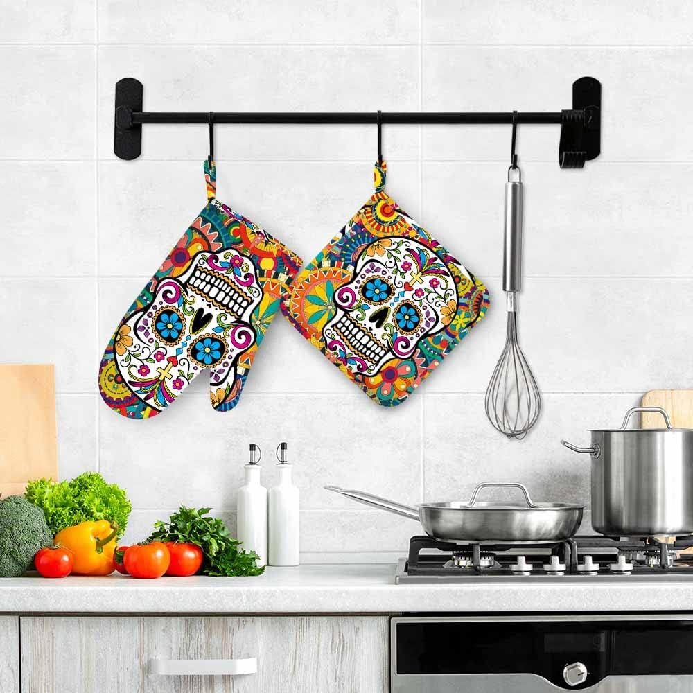 Art Floral Sugar Skull Silicone Oven Mitts and Pot Holders Sets BBQ Gloves for Kitchen,Cooking,Baking,Grilling