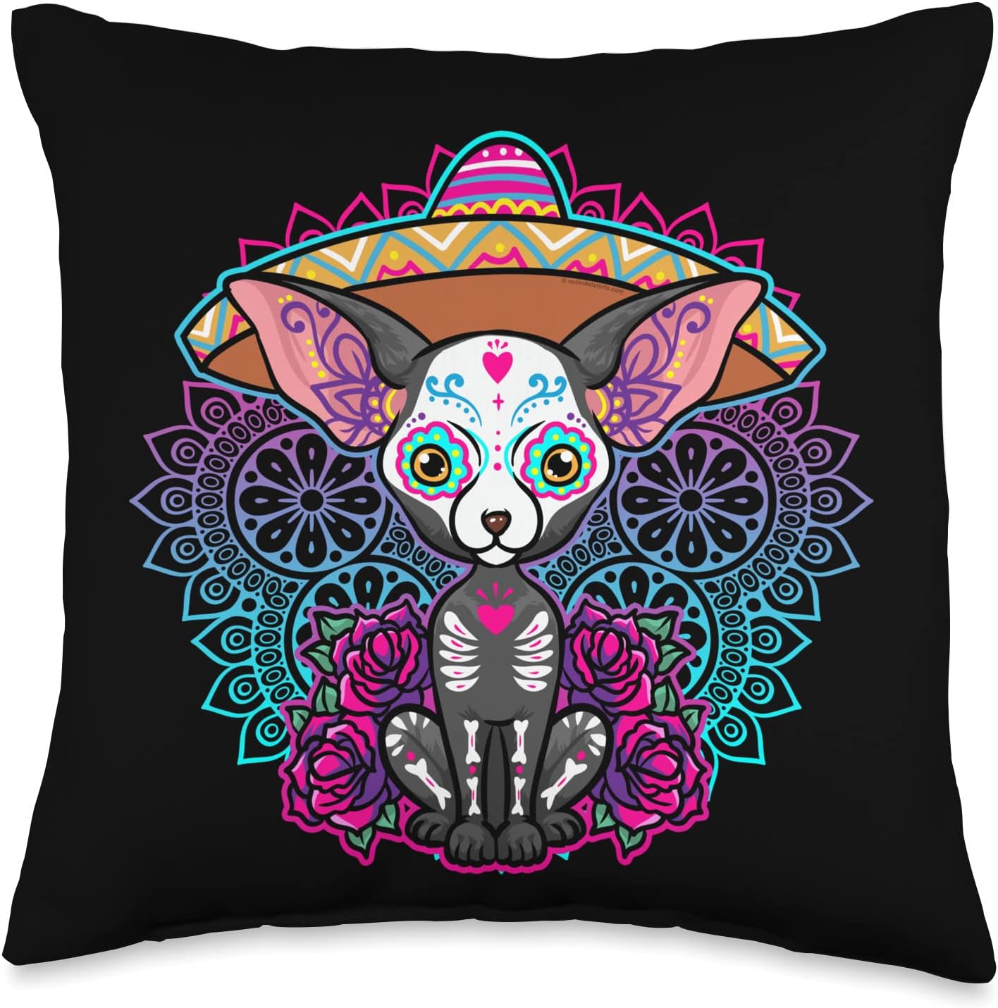 A colorful kawaii Chihuahua puppy, wearing a Mexican hat character in the Day of the Dead Día de Los Muertos style, is featured. Click on our brand name for more Day of the Dead designs for women, men & kids.
